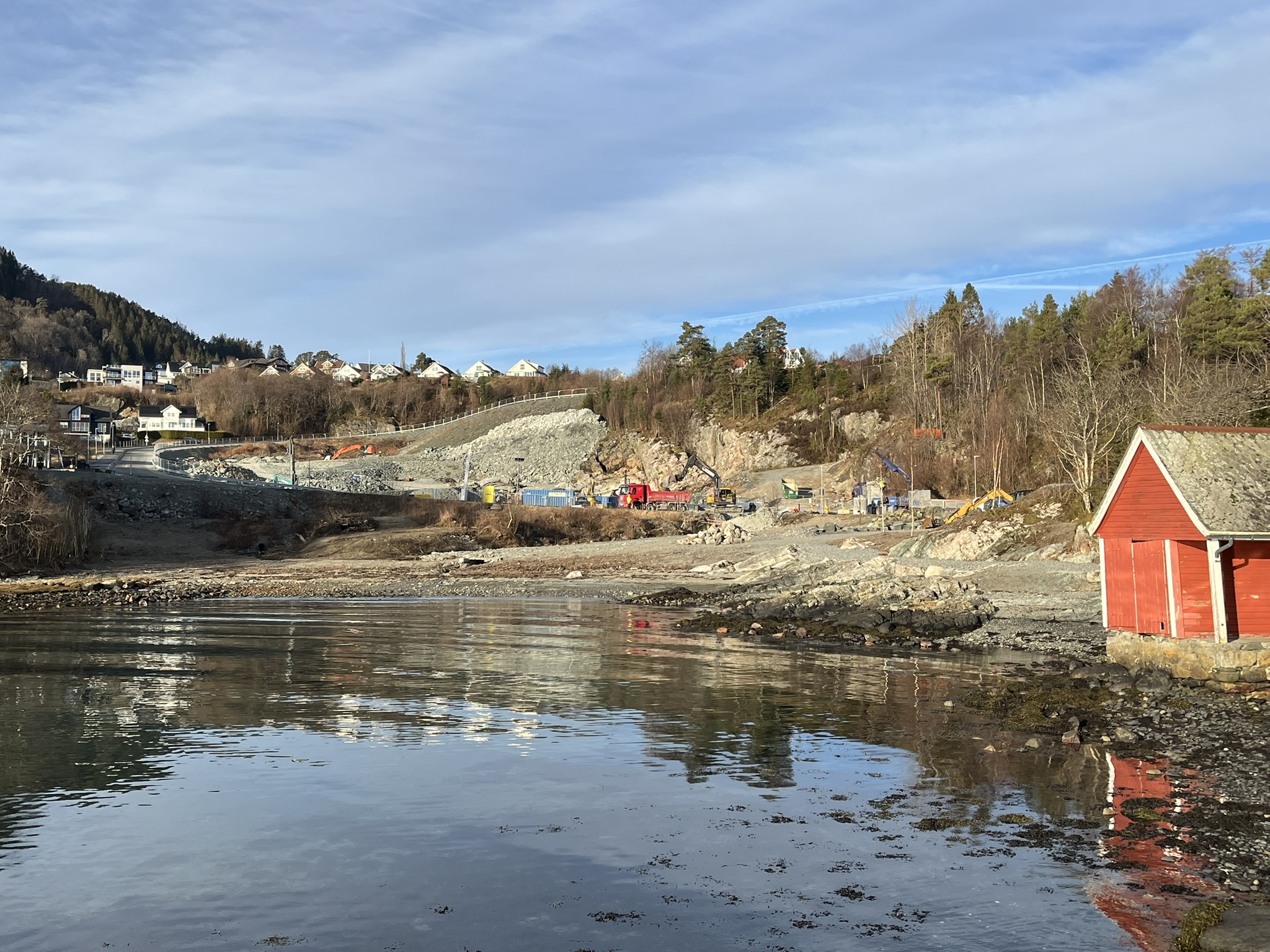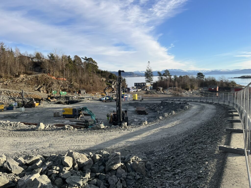 Totalentreprenør Brødrene Ulveseth AS jobber med sprengning og planering av den sørlige delen av tomten. Planeringsnivået som nå vises på den delen av tomten, tilsvarer gulvet i parkeringsgarasjen.